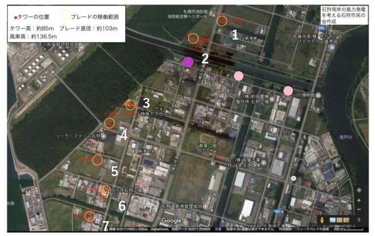 1号機から7号機について、タワーの位置とブレードの稼働範囲をグーグルの写真に入れてみました。ブレード直径約100mとして扱っています。道路や建物のすぐそばでブレードが回転するという事態になります。