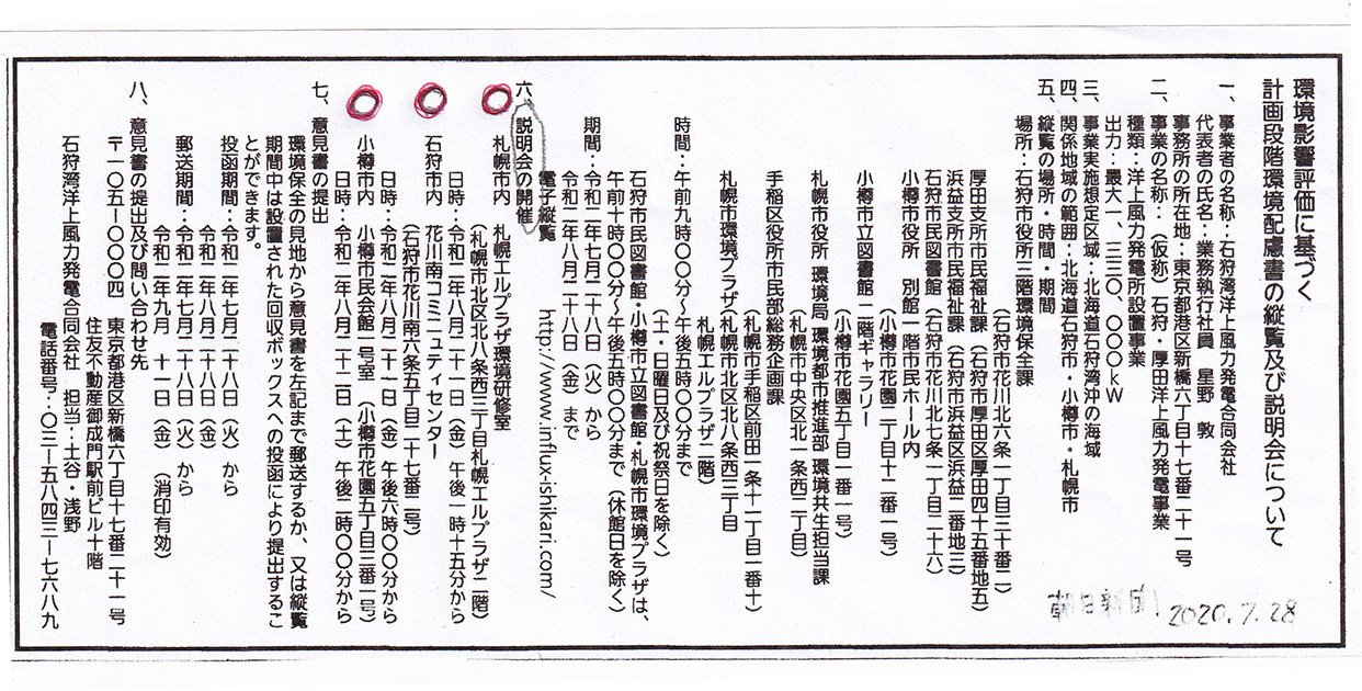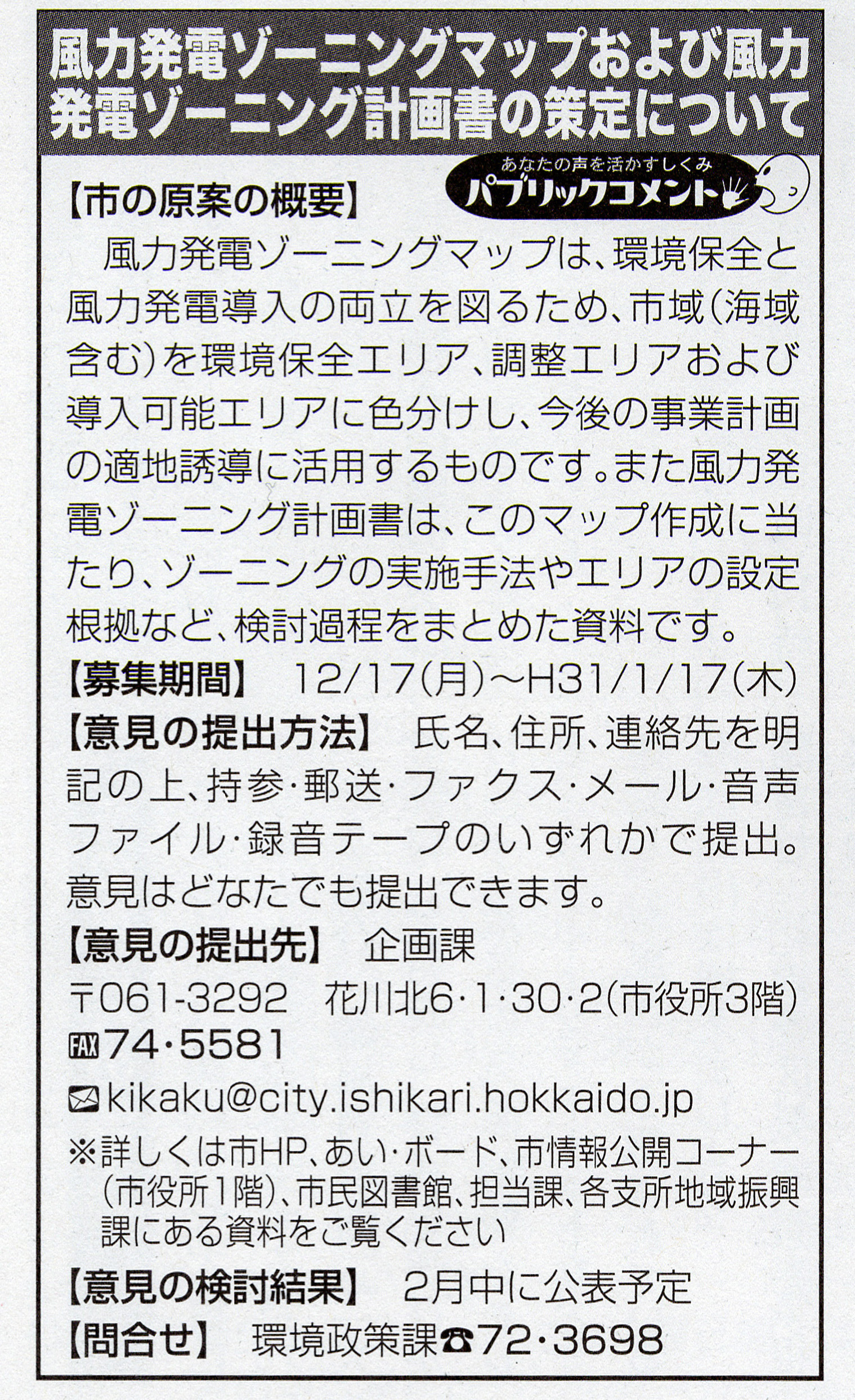 問合せ: 石狩湾岸の風力発電を考える石狩市民の会 安田さん(090-6211-1602)