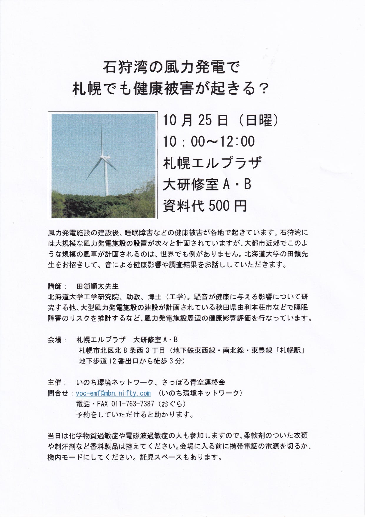 問合せ : 石狩湾岸の風力発電を考える石狩市民の会代表 安田さん 090・6211・1602